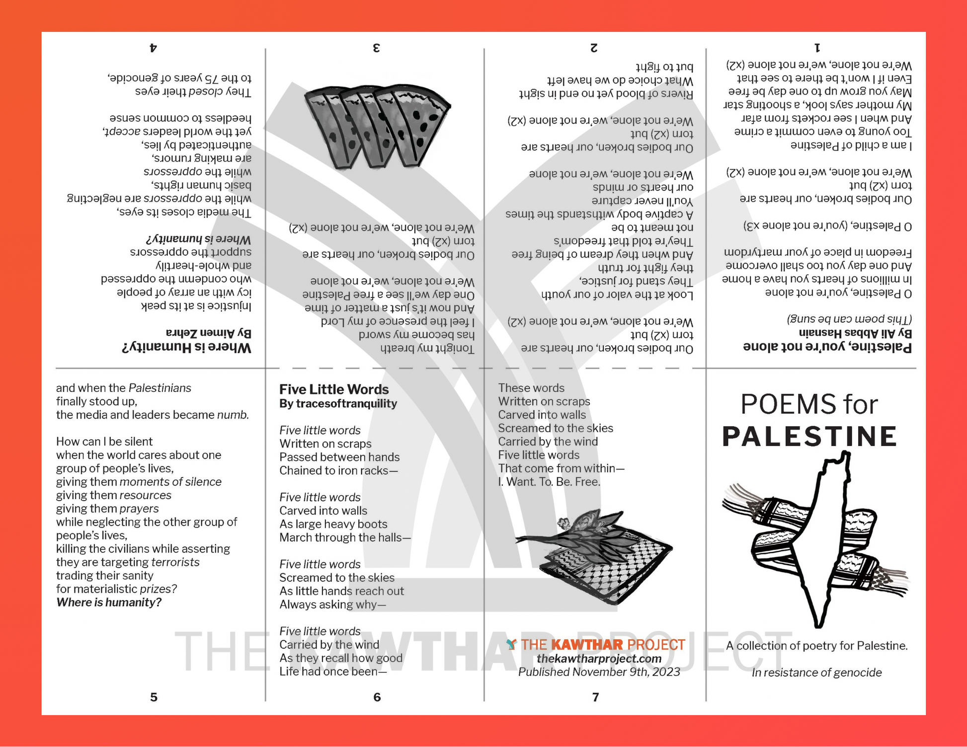 This is a collection of poetry and art for Palestine. It's meant to be passed at various rallies and discussions in resistance against genocide.